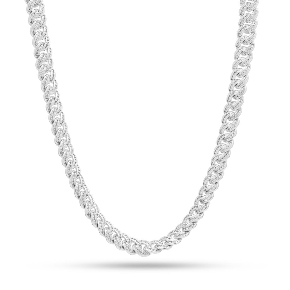 The Miami Cuban Curb remains one of the most iconic and favored chains in hip hop. Each studded version of the chain uses handset CZ stones that line the exterior of each link, creating a one-of-kind look for those after that flashy, iced look. The chain is available in 14K Gold plating, as well as white gold plating. There are multiple lengths available for different styles. The custom Greek Key box clasp offers a secure and comfortable wear.