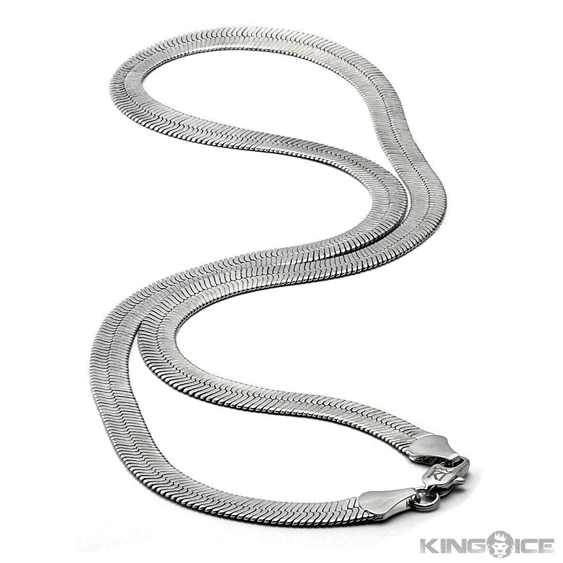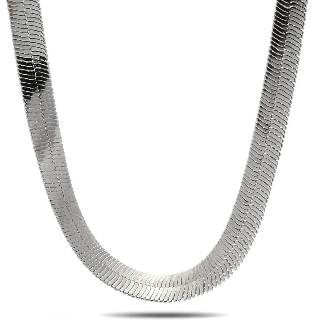 Herringbone chains, also known as the flat chains, go back to ancient Egyptian times that show sophistication with its design. Each necklace is designed to mimic the bones of the herringbone fish with parallel and slanted bones. This herringbone chain features rhodium plating and a box clasp closure.