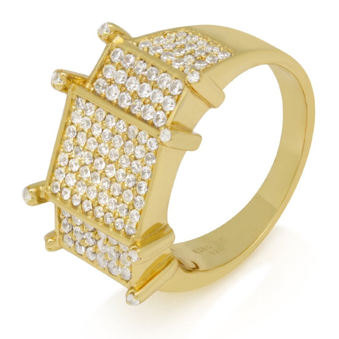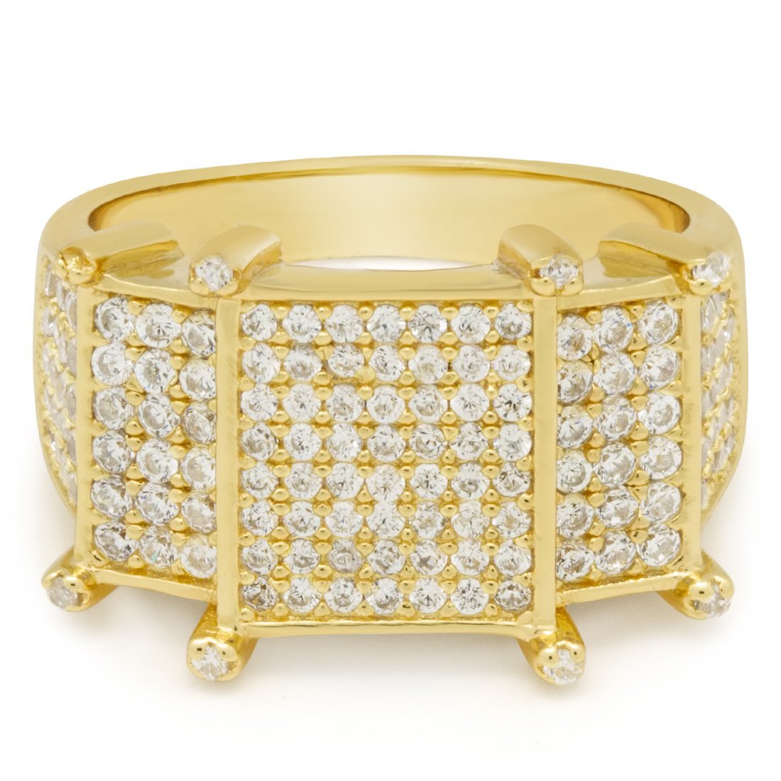 Covered in VVS Diamond Simulates, the new 14K Gold Triple Prong Ring is perfect for any outfit. With five sections covered in stones, its shine is never ending. The .925 Sterling Silver ring is plated with 14K Gold for a nice pair with the clear stones.
