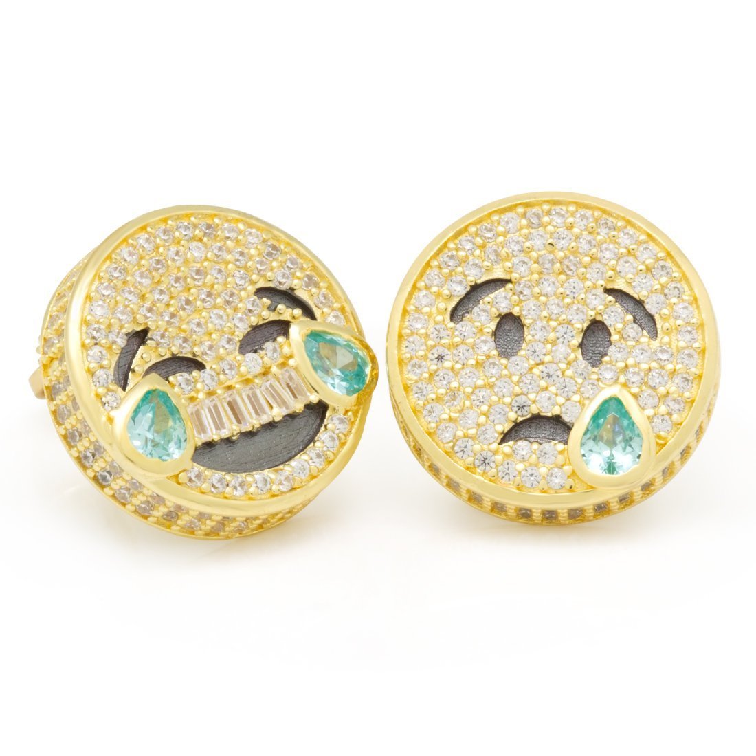 The saying goes, "laugh now, cry later," but now you can do it in style. The emoji earrings are made out of .925 Sterling Silver. One earring has an emoji-like face with turquoise VVS Diamond Simulates posing as tears while the other earrings has a a sad, crying face with a turquoise VVS Diamond Simulate as a tear. All earrings are plated with 14K Gold and have screw post backings for secure wear.