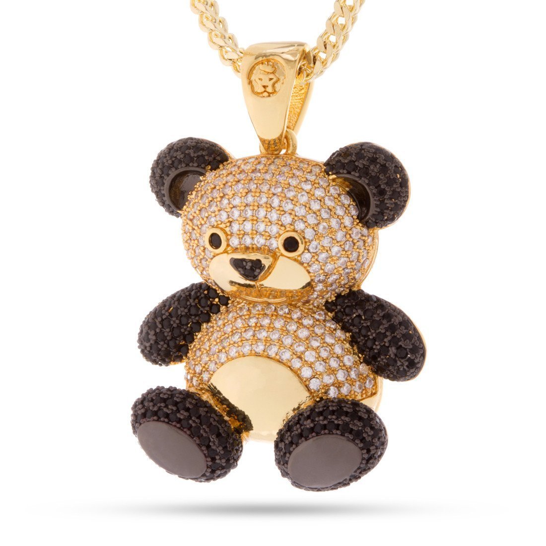 Compared to other panda bears, this 14K Gold CZ Panda Necklace isn't soft, and it sure isn't cuddly. It's built tough to withstands the rigors of the streets, and with 14K gold and black rhodium plating, this solid piece provides added shine and durability, while the black and clear CZ stones add that iconic hip-hop look to this piece. Each features a 24" 2.5mm stainless steel Franco chain to match with the Greek Key casing featured on the back of each pendant.