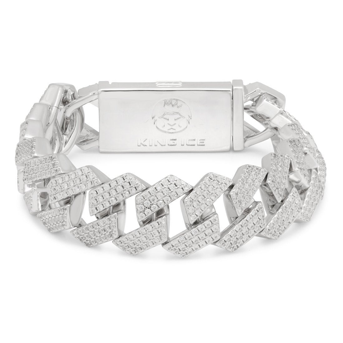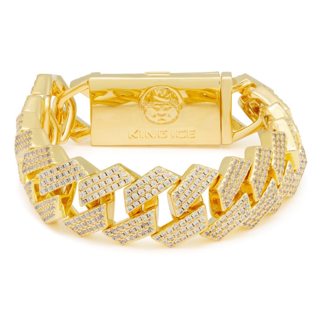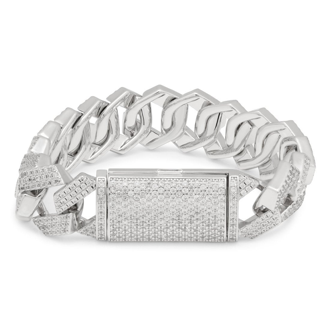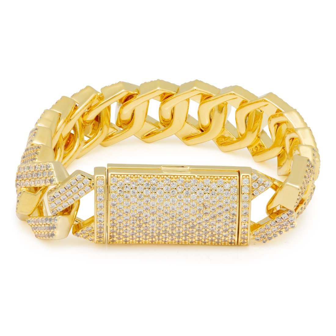 The new 18mm Diamond Cut Miami Cuban Bracelet features a straight, sharp link design. The bracelet features 32 links total. With each link having 20 CZ stones, the chain includes more than 640 CZ stones, giving it the ultimate iced look. The bracelet is available in 14K Gold plating and white gold plating and measures 8". It features a custom box clasp that is iced with even more CZ stones.