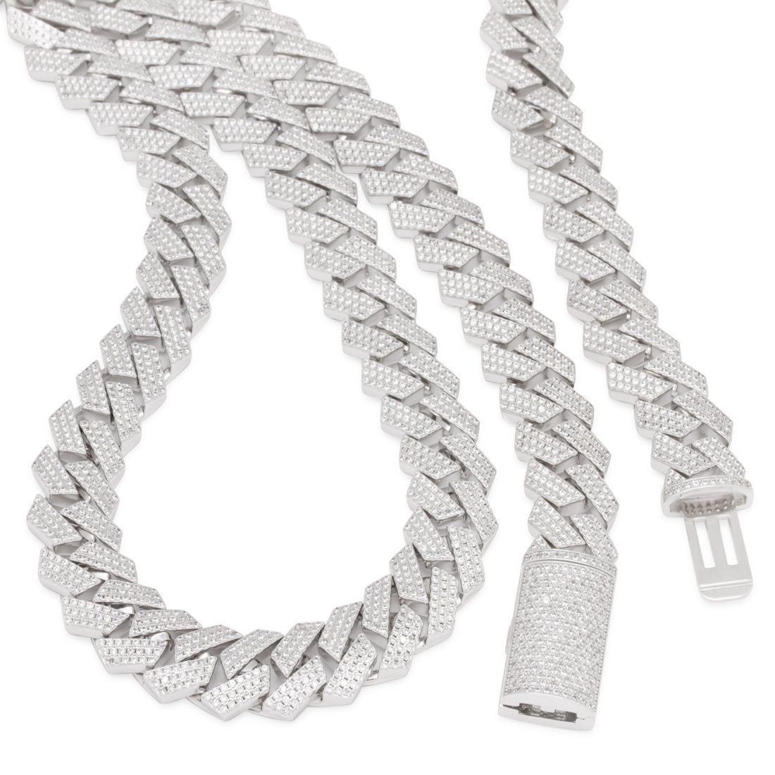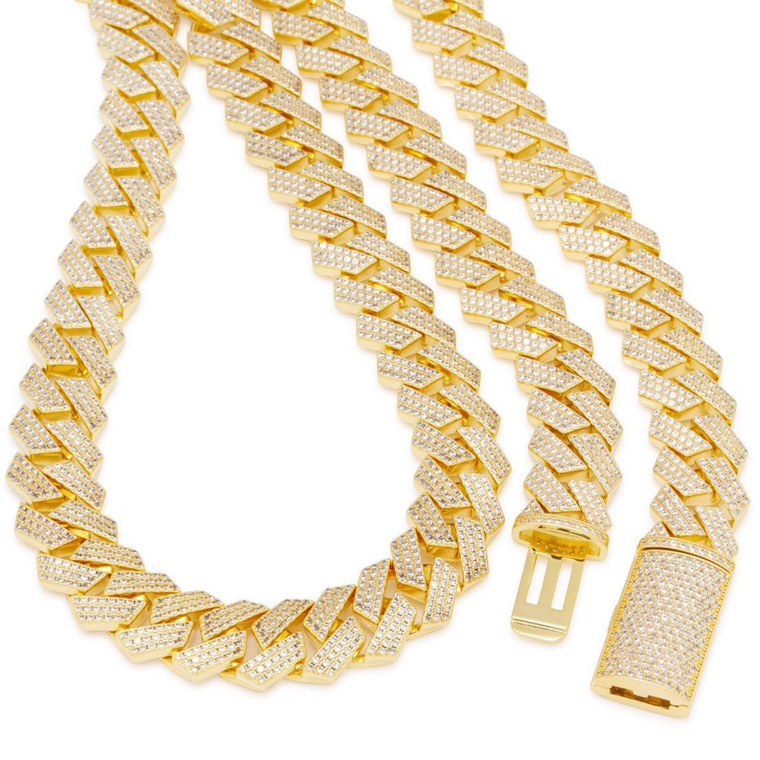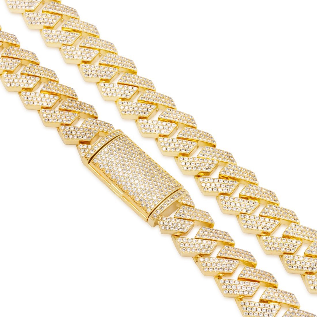 The new 18mm Diamond Cut Miami Cuban Chain features a straight, sharp link design. This chain and custom lock box is iced with more than 1,800 VVS Diamond Simulate stones. The chain is available in 14K Gold plating and white gold plating in various lengths.