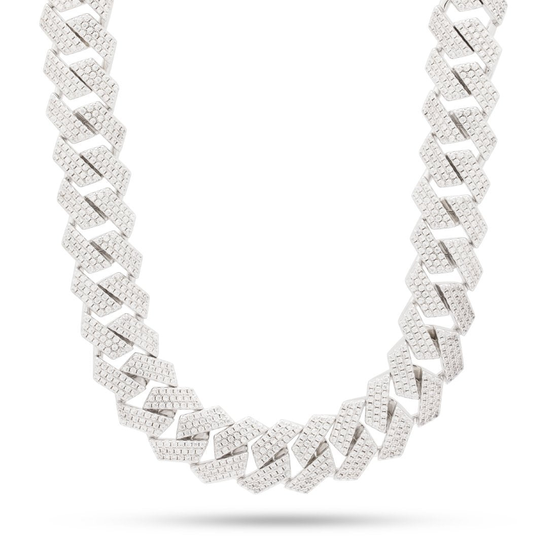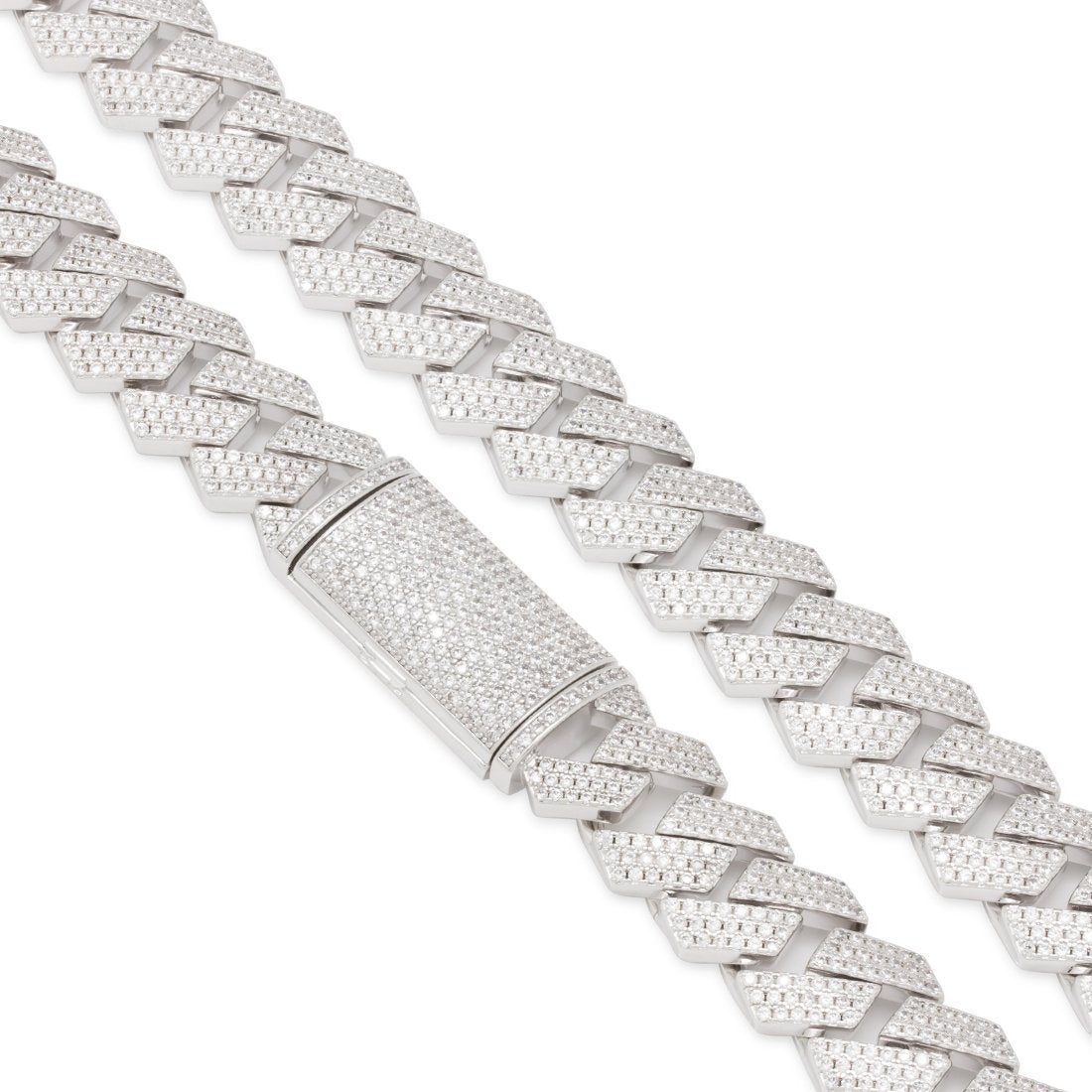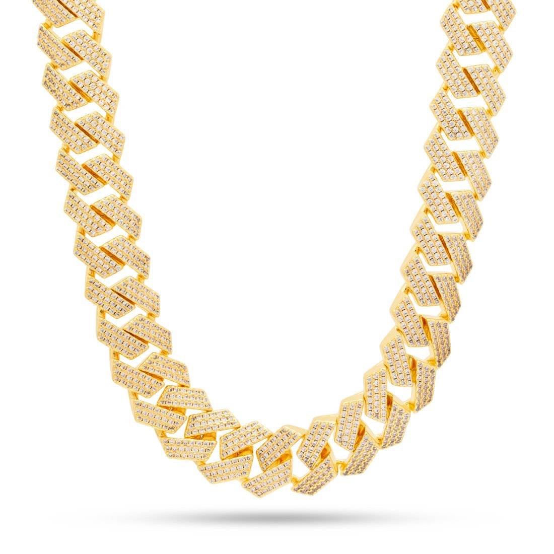 The new 18mm Diamond Cut Miami Cuban Chain features a straight, sharp link design. This chain and custom lock box is iced with more than 1,800 VVS Diamond Simulate stones. The chain is available in 14K Gold plating and white gold plating in various lengths.