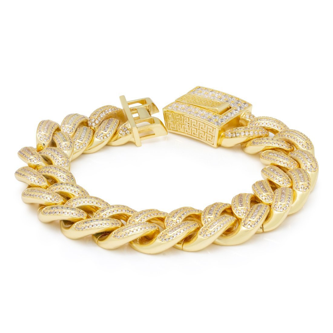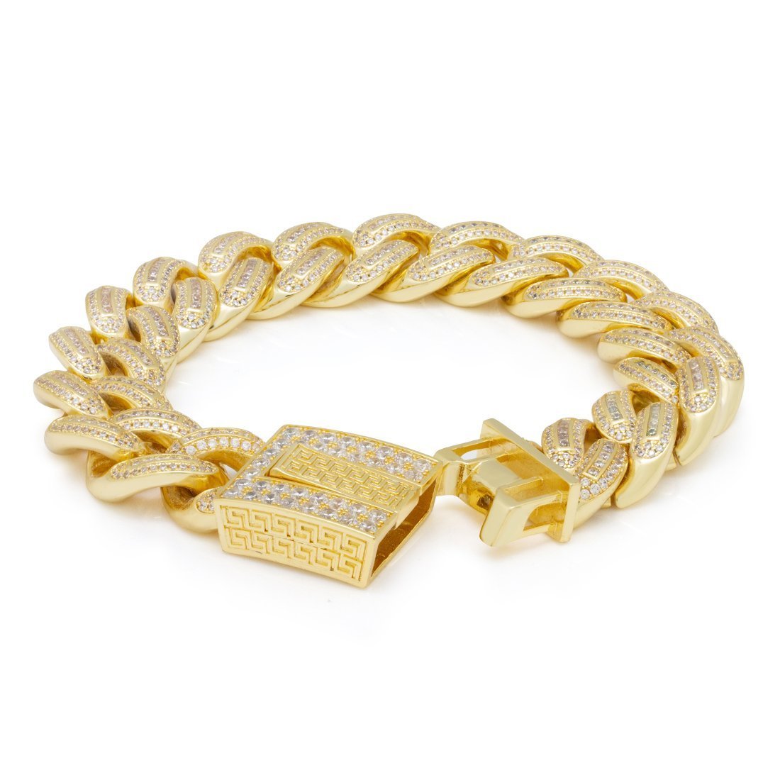 Completely iced with over 1,000 CZ stones, the new 18mm Iced Miami Cuban Bracelet has a heavy set look to it. Available in 14K Gold plating and white gold plating, the 8" bracelet matches perfectly with the chain. The bracelet comes with a custom Greek Key box clasp that's iced with large CZ stones for a secure and comfortable wear.
