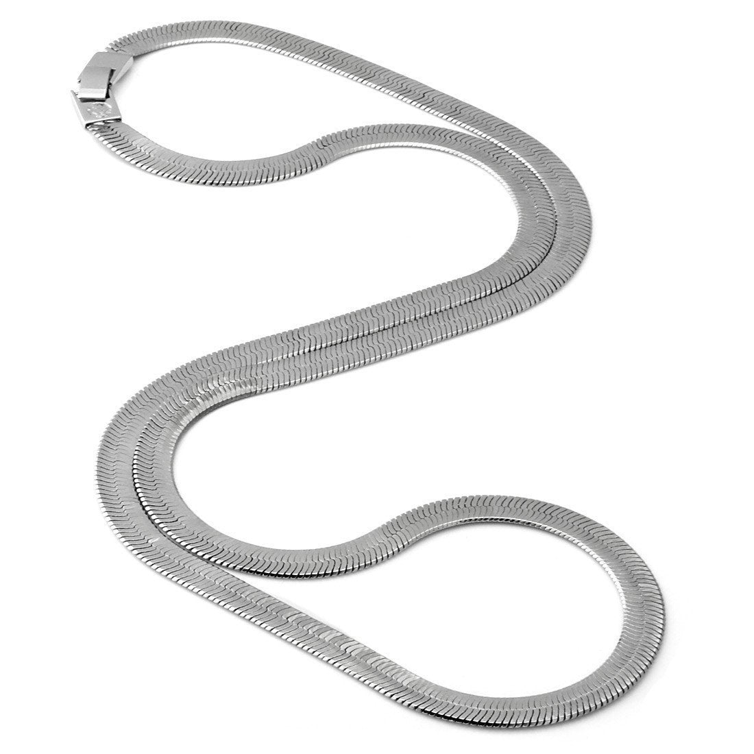 Inspired by the ancient Egyptian, this 8mm Herringbone comes dipped in rhodium plating for added shine, while the new fold-over clasps provide faster placement and removal. Each chain link mimics the parallel and slanted bone structure of herringbone fish. And as a favorite chain type of Tupac, you'll enjoy the old school hip hop nostalgia this item offers.