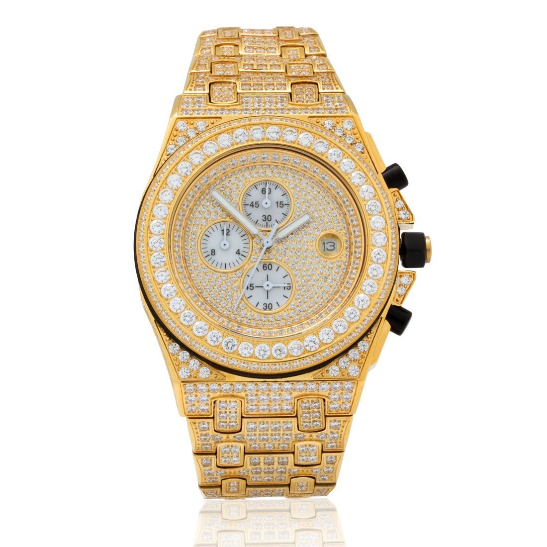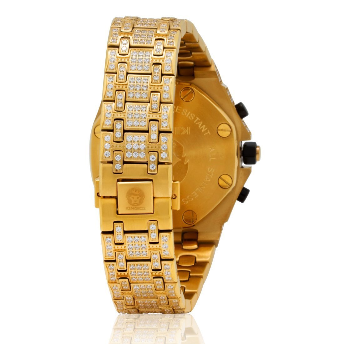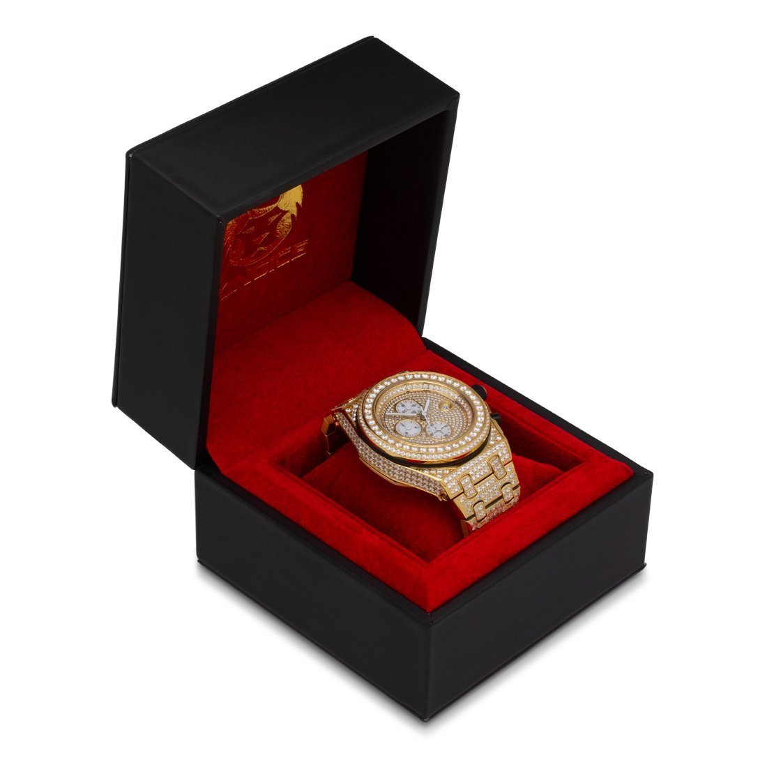 The Baron earns its name from the beautiful handset stones covering both the face and band. Available 14K Gold plating, white gold plating and rose gold plating, the steel band on the watch provides added value. Each features a 1 3/4" large watch alongside a 1" band giving the Baron a mid-sized look, and with three chronographs tracking time, the Baron provides pin-point accuracy.