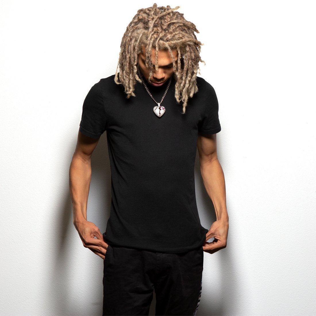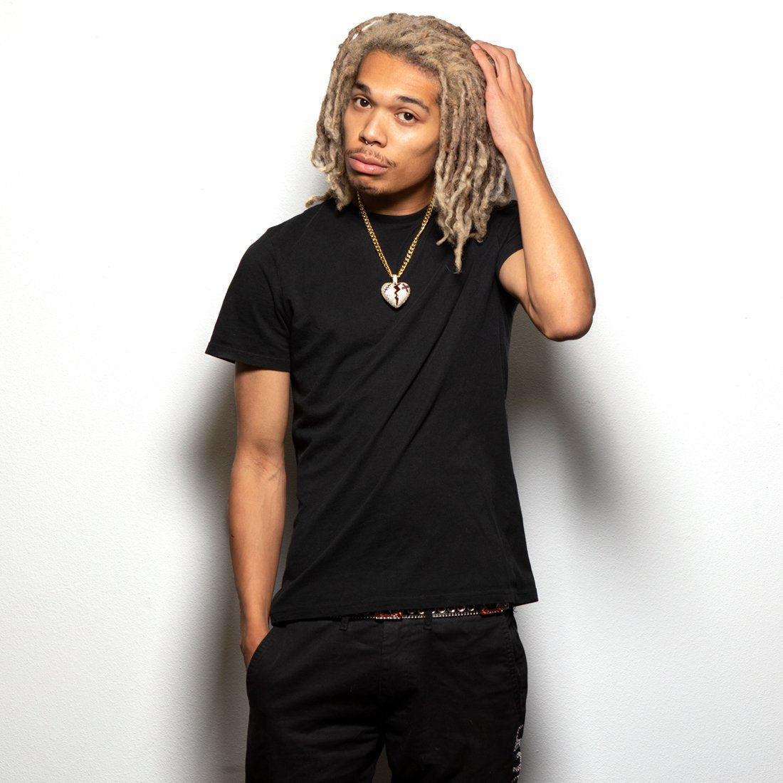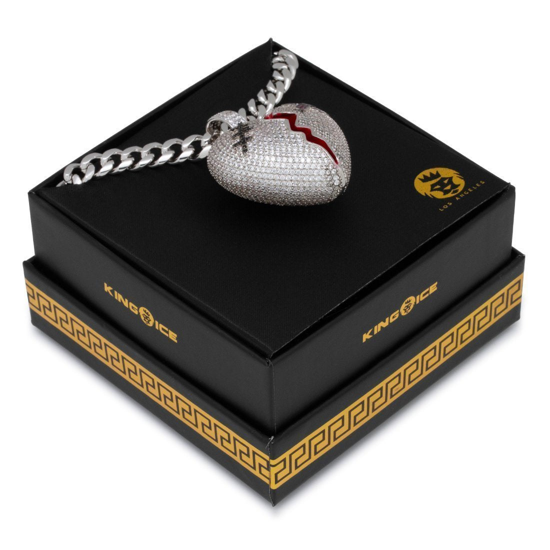 Having a broken heart isn't fun or daring, but the iced Broken Heart Gold Necklace is. Each heart is split with a zigzag motion and red on the inside, as if there's anything left to spill out. A magenta VVS Diamond Simulate band aid and an onyx VVS Diamond Simulate stitch band aid decorate the broken heart. 14K Gold plating give the broken heart necklace a flossy, finished look. Each necklace is accompanied by a 20", 8mm Miami Cuban Chain.