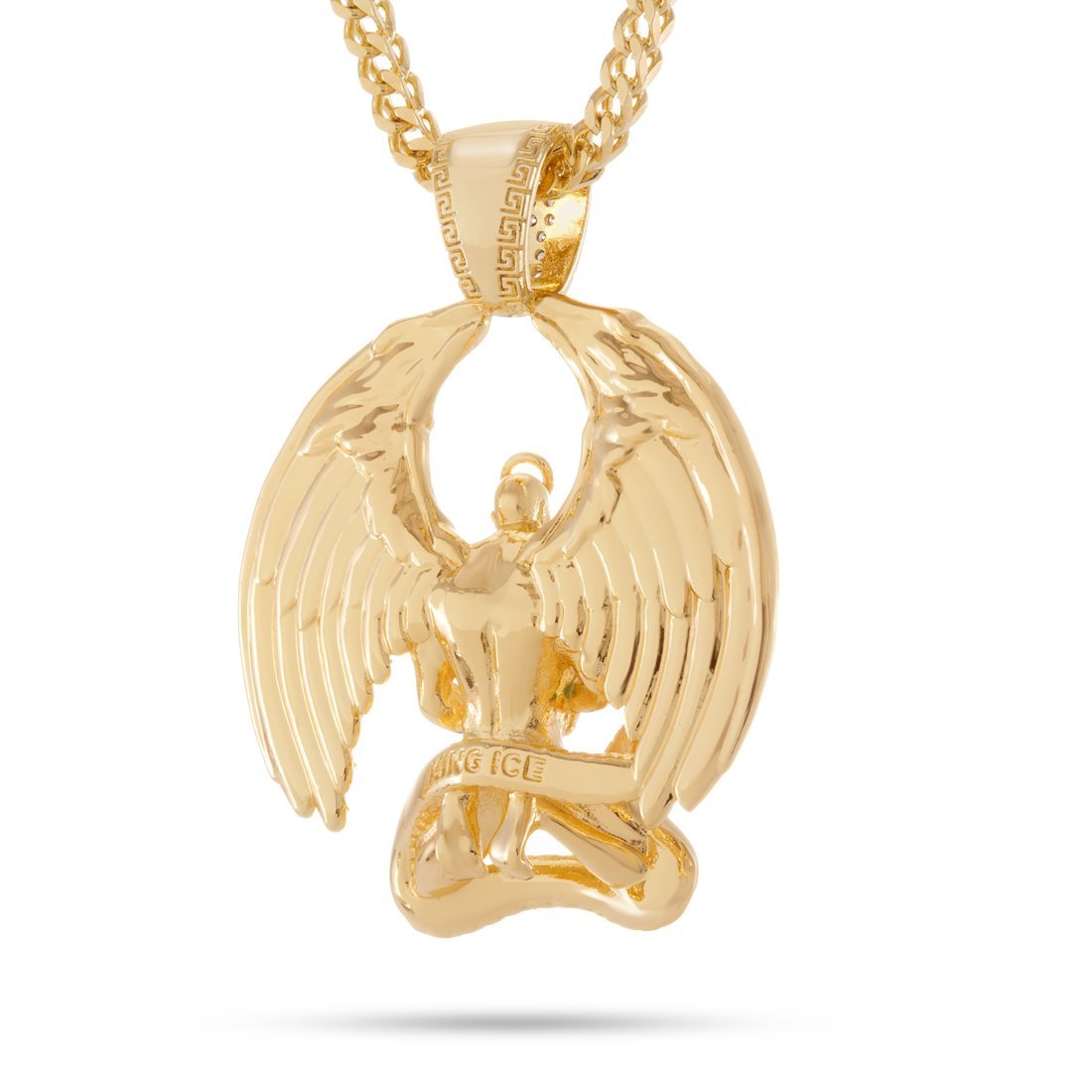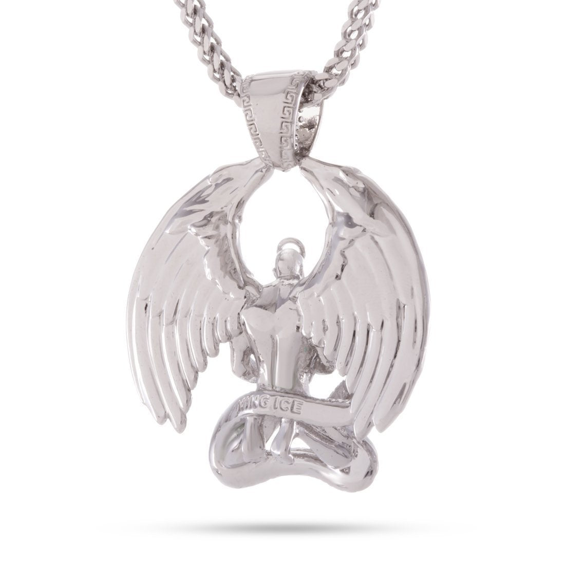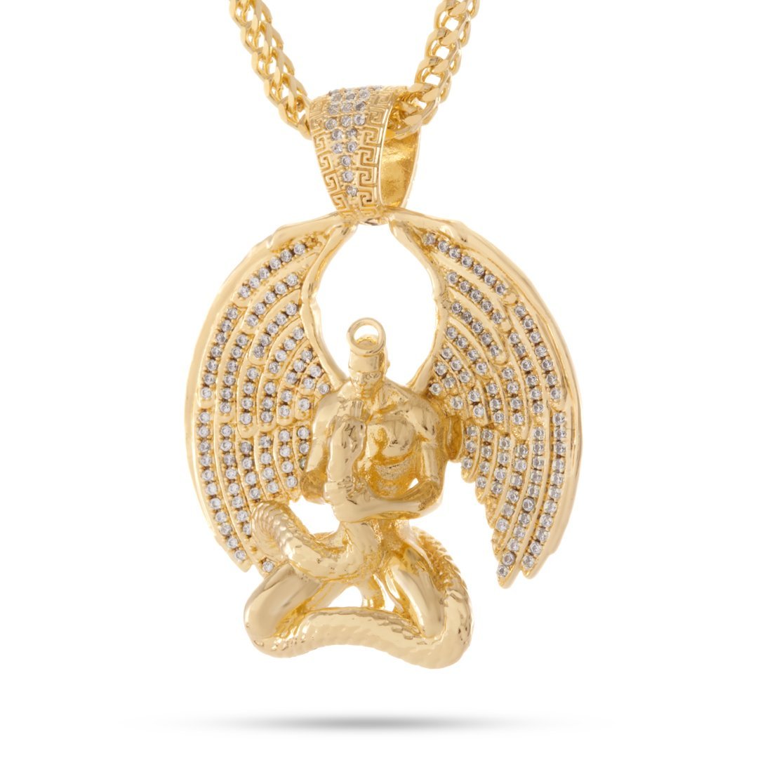 Our Euphanasia pendant brings to life one of the most iconic symbols in streetwear. Each Pendant features an angel holding and killing the snake to free itself from its clutches.This piece is paired with a 24" 2.5mm franco chain.