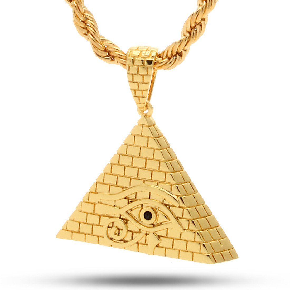 Get your hands on this one of a kind All Seeing Eye Necklace. This necklace features a Pyramid with a All Seeing Eye on it, there is a black CZ stones in place of the eye. The pendant is solid and finished off in a quality gold plating. Includes a matching 24", 4mm rope chain. Also available in silver, get yours today!