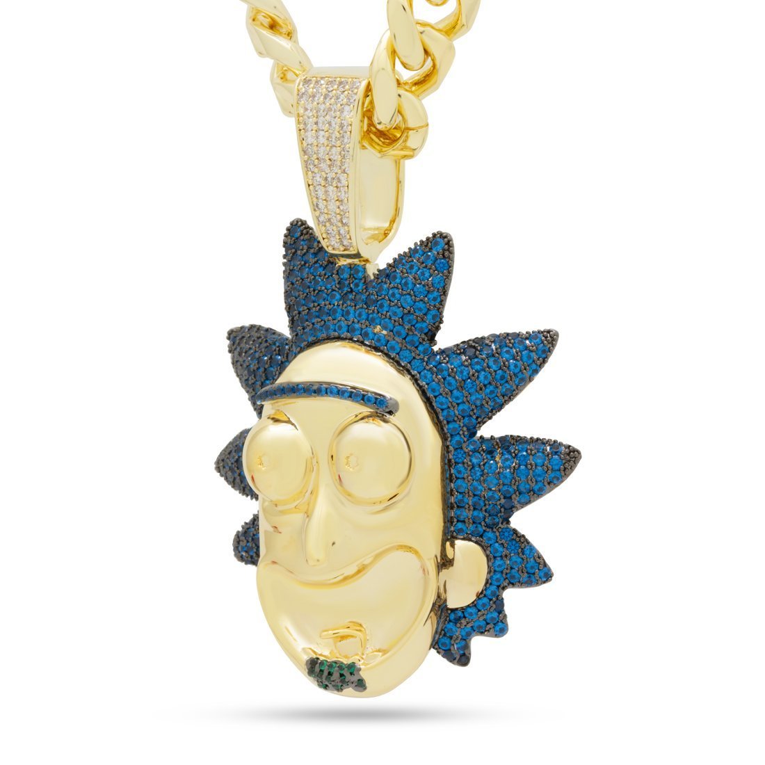 The Good Rick pendant showcases the mad scientist in aquamarine VVS Diamond Simulate stones and 14K Gold plating for a vibrant display. The 3D design provides that excitable and crazy grin of Rick that viewers know. The small size pendant is paired with an 8mm, 20" Miami Cuban chain, while the large pendant comes with a 12mm, 24" Miami Cuban chain.