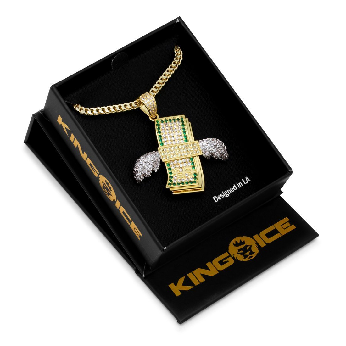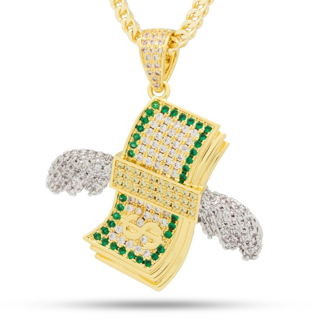 Just like the emoji, the Money With Wings Necklace gives off the flamboyant image of flashy money. Each pendant is finished with 14K gold and 14K white gold plating, as well as clear and emerald green  VVS Diamond Simulates. Each piece comes with a 2.5mm, 20" stainless steel Franco chain.
