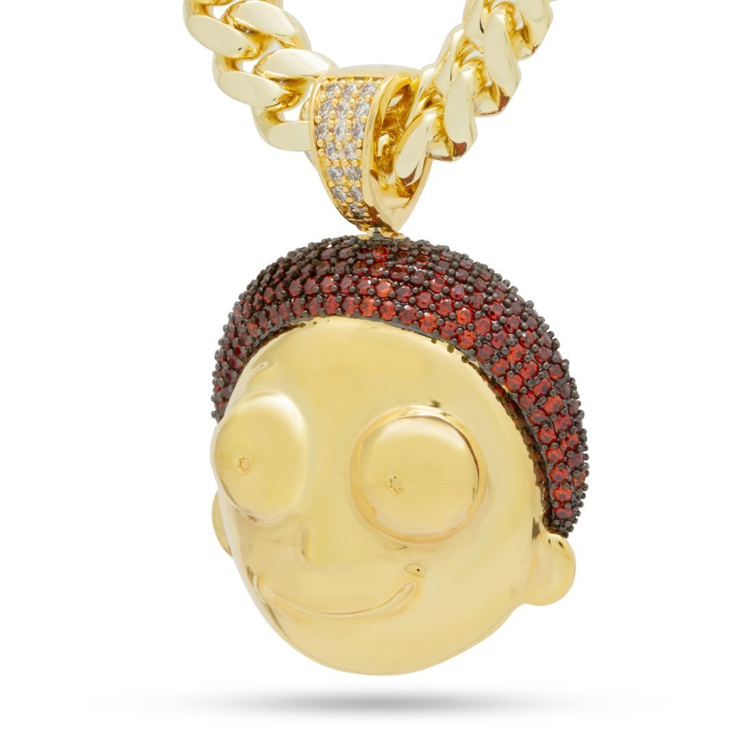 The XL Good Morty pendant showcases Morty with a 3D design, detailing his facial features and smile. Brown VVS Diamond Simulate stones decorate his hair on the black gold plating. Each pendant is plated with 14K Gold plating and is paired with an 8mm, 24" Miami Cuban chain.