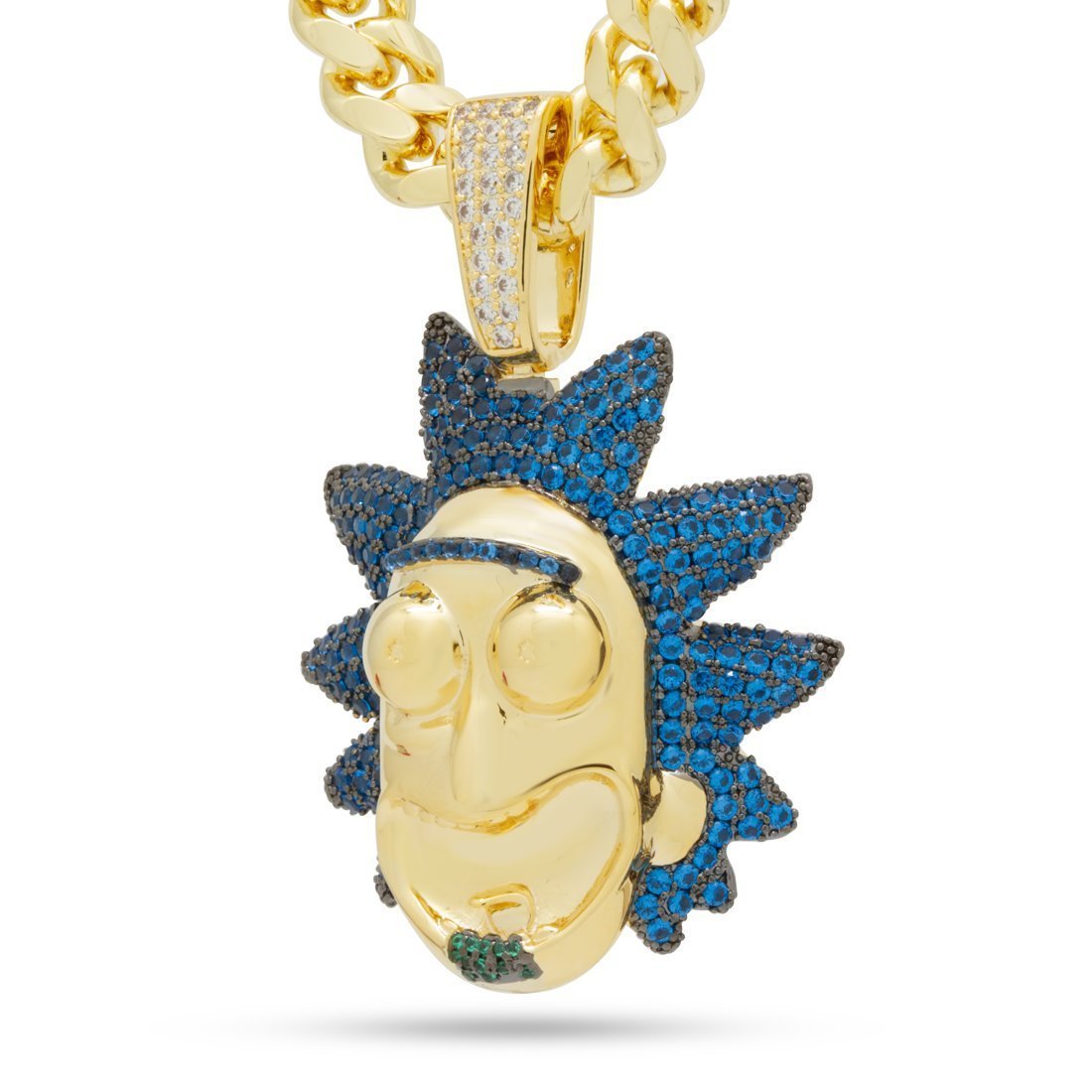 The XL Good Rick pendant showcases the mad scientist in aquamarine VVS Diamond Simulate stones and 14K Gold plating for a vibrant display. The 3D design provides that excitable and crazy grin of Rick that viewers know. The small size pendant is paired with an 8mm, 20" Miami Cuban chain, while the large pendant comes with a 12mm, 24" Miami Cuban chain.