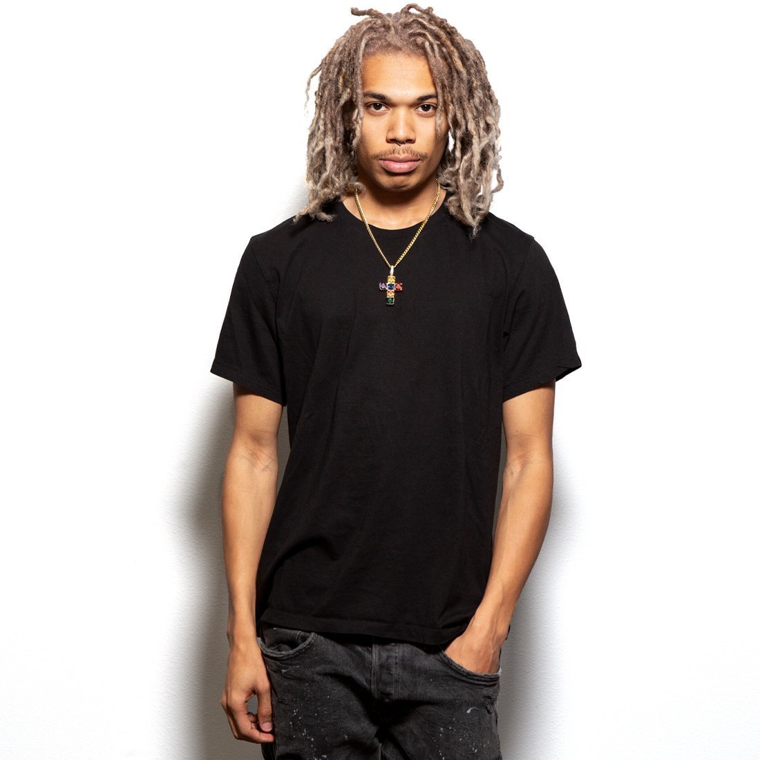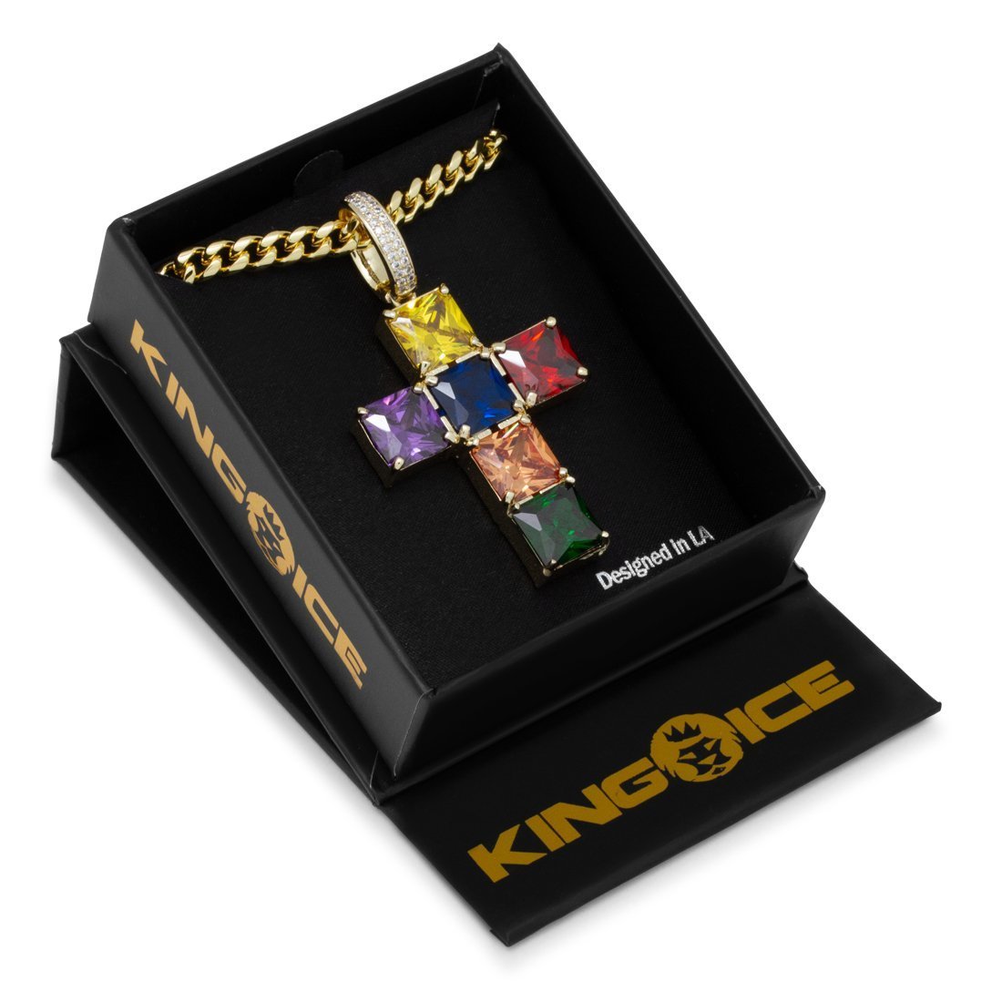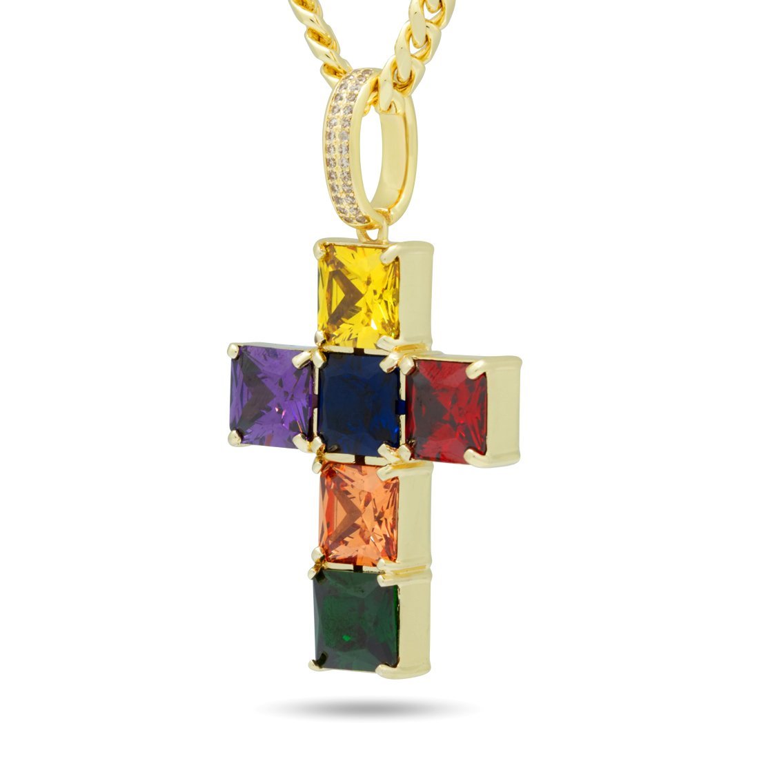 The Spectrum Cross Necklace is iced with multicolored VVS Diamond Simulates to form the spectrum rainbow. The 14K Gold plated necklace has Greek Key design on the back for a subtle finish. Each necklace is paired with a 5mm Miami Cuban Chain 20".