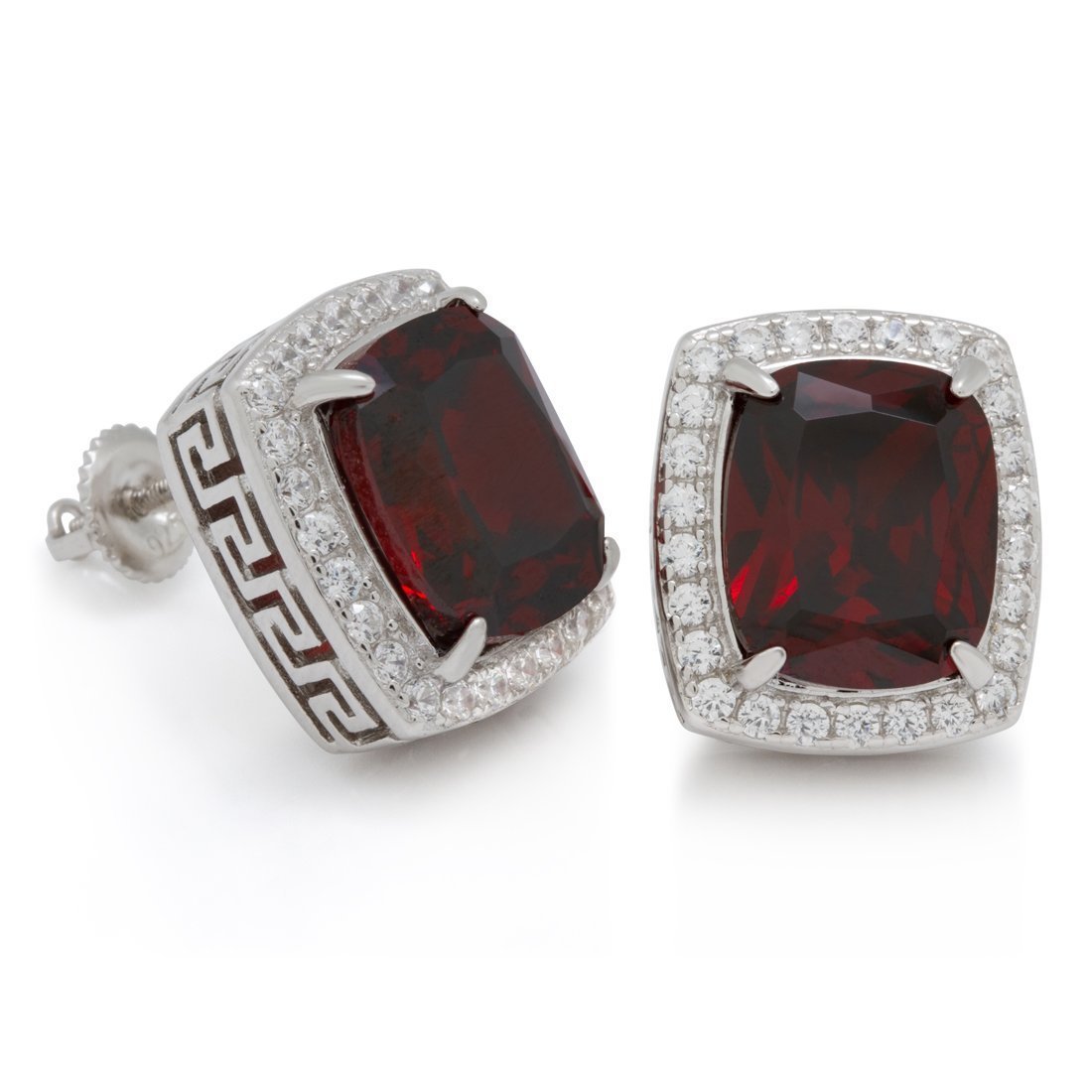 With a ruby stone big enough to catch your eyes' attention, the Crown Julz earrings are outlined with a single row of clear VVS Diamond Simulates. A Greek Key design borders the earrings for a thick set look. The earrings are plated in a 14K gold or white gold finish.