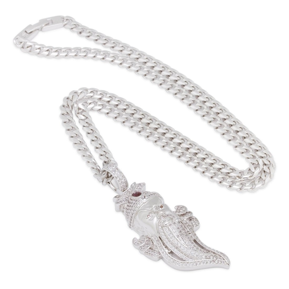 Known as the God of War during the Eastern Han Dynasty in China, Guan Yu was a warrior for his people. Many knew him to be courageous, strong and loyal. Now, King Ice pays tribute with an iced Guan Yu necklace. Each necklace is plated with 14K Gold and VVS Diamond Simulates border Yu's design. A red ruby simulate brightens Yu's head wear for extra color. The back of every pendant has "loyalty" and "integrity" engraved in Chinese to complete Guan Yu's necklace. Each small necklace is accompanied with a 5mm, 20" Miami Cuban Chain and each large comes with an 8mm, 20" Miami Cuban Chain.