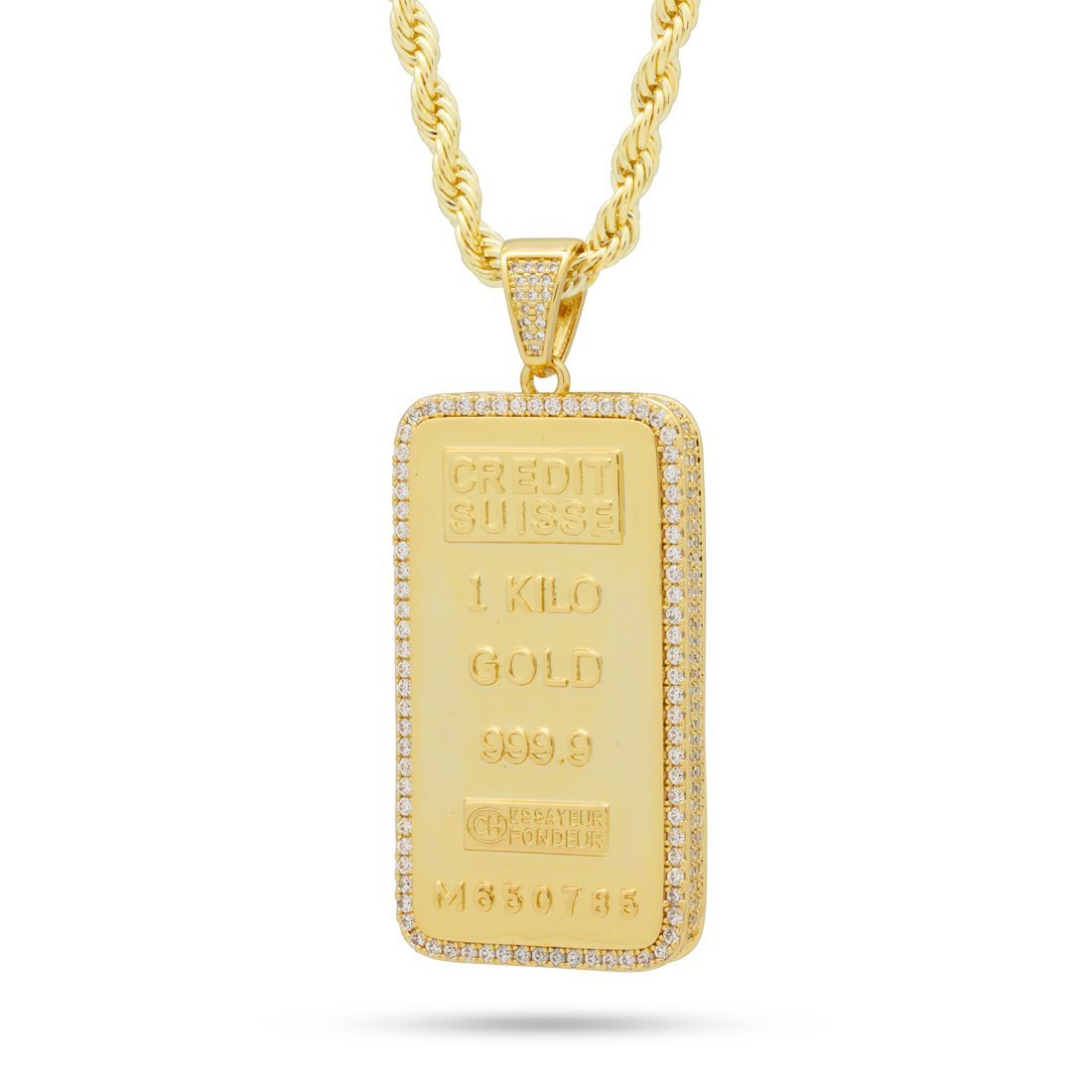 Also known as a gold bullion, a 1-Kilo Gold bar is worth thousands in today's market. King Ice has replicated its design with a 14K gold finish and aligned with CZ stones bordering the pendant for a vibrant look. It is paired with a 4mm, 26" Stainless steel Rope chain.