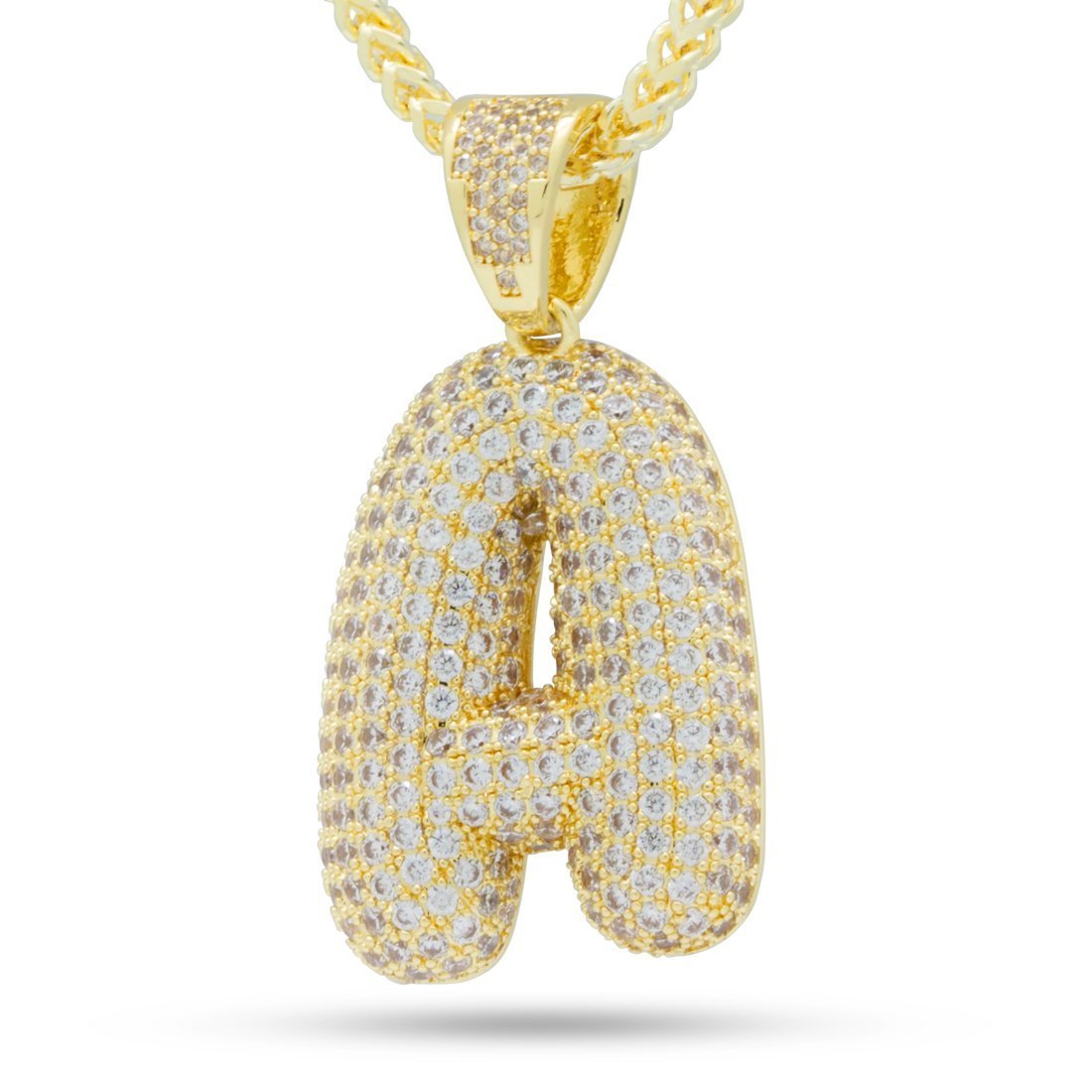 Plated in 14K Gold and lined with clear VVS Diamond Simulates, the Bubble Letters create an iconic street wear staple piece. Each piece belonging to the collection features a 2.5mm 14K Gold plated, 20" Franco chain to complete its look.