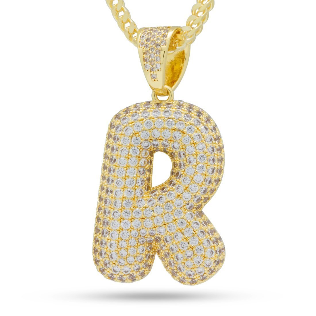Plated in 14K Gold and lined with clear VVS Diamond Simulates, the Bubble Letters create an iconic street wear staple piece. Each piece belonging to the collection features a 2.5mm 14K Gold plated, 20" Franco chain to complete its look.