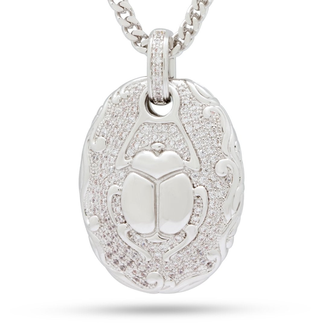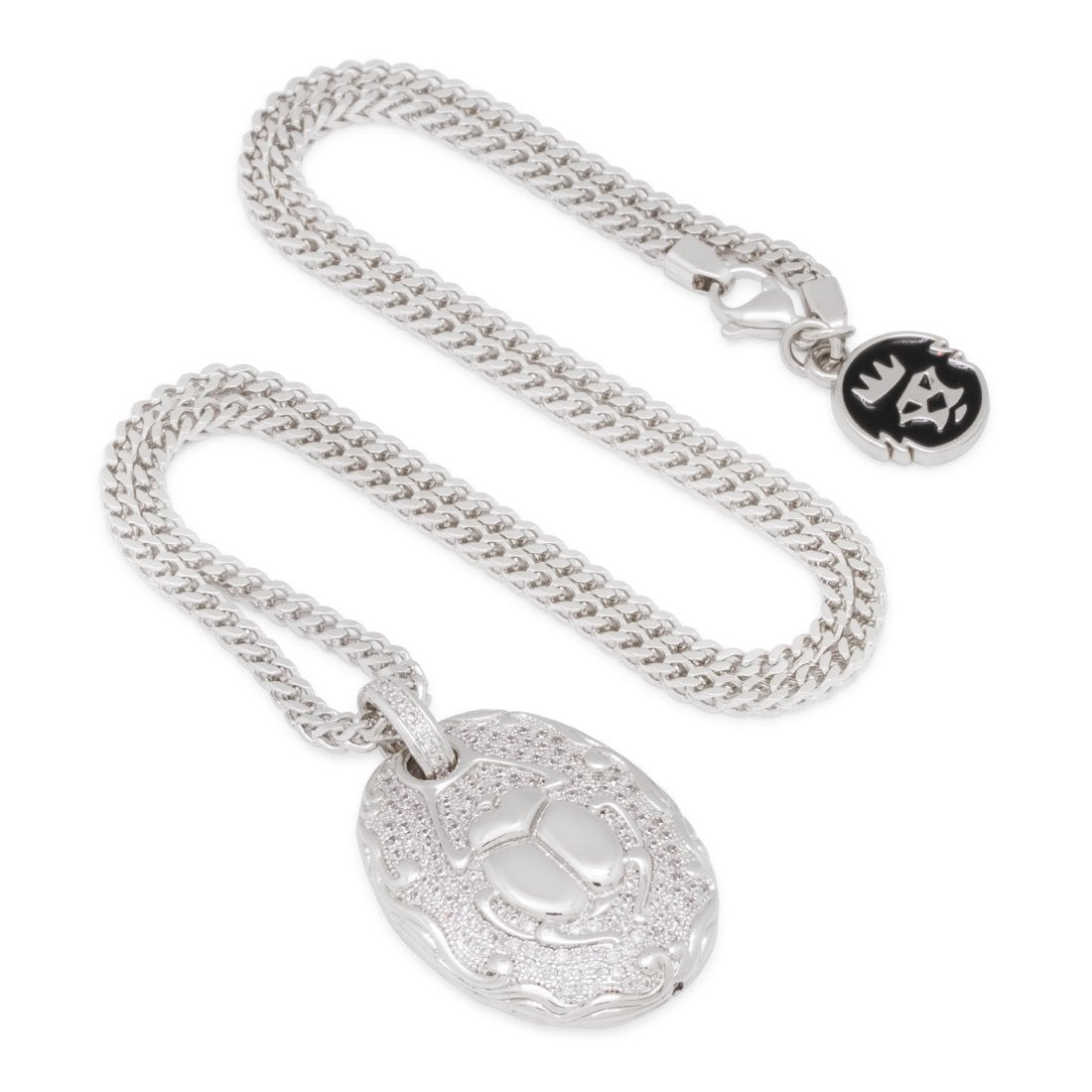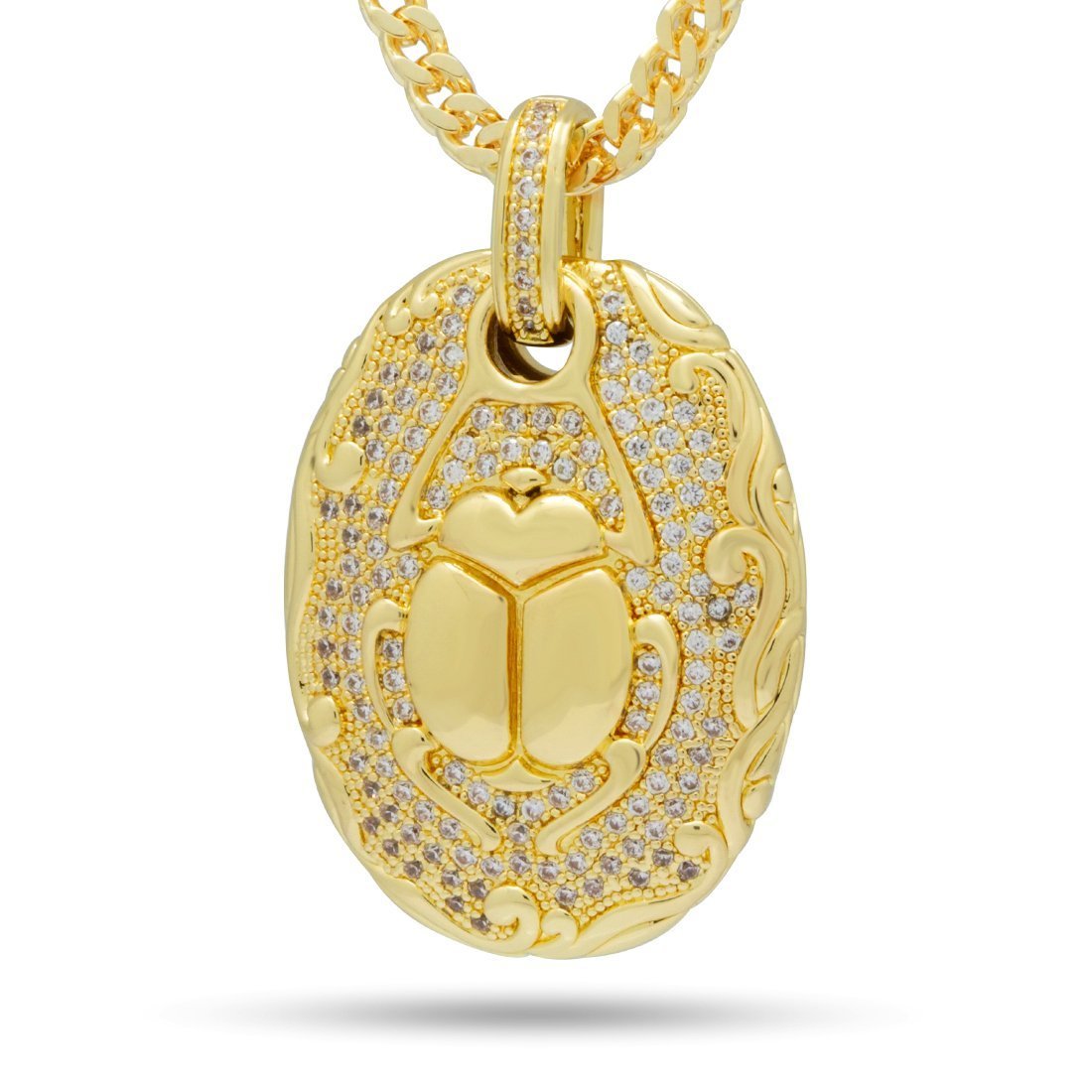 The new scarab beetle necklace pays tribute to the Egyptian Sun God Khepri. Khepri is also a symbol of death and rebirth. Each scarab is encrusted with handset CZ stones to illuminate the beetle's body. Each necklace is plated with 14K Gold and comes with a 2.5mm, 20" Franco Chain.