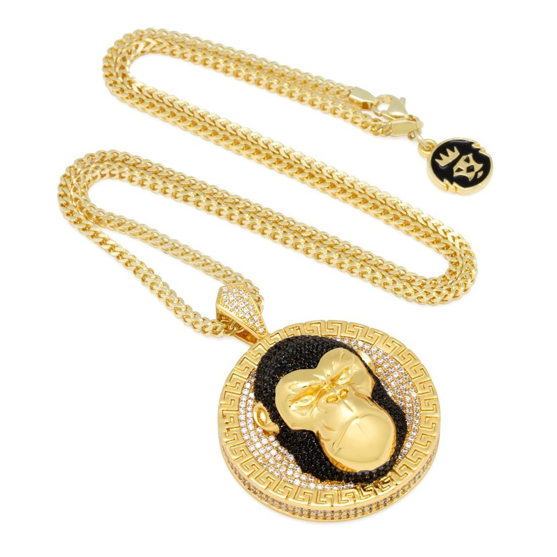 The menacing look on the gorilla's face is enough for a hard look with the new gorilla medallion. Each medallion is iced with clear and onyx colored VVS Diamond Simulates. Greek key design and more simulates border the medallion for a sleek finish. Each medallion is paired with a 2.5mm, 24" Franco Chain.