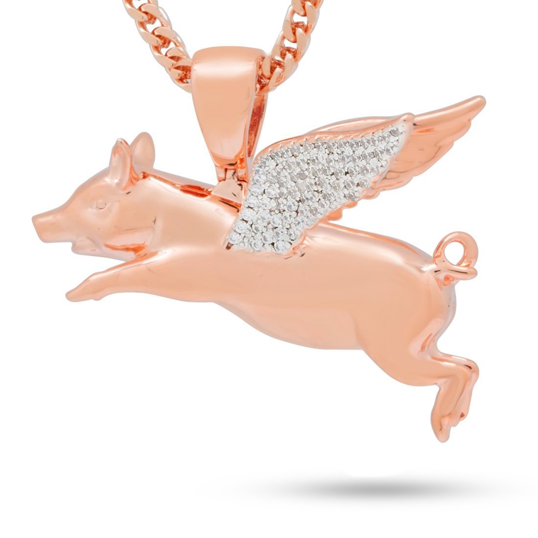 "When pigs fly" is a figure of speech that ultimately means the impossible. However, King Ice made it possible. The new Flying Pig does just that, swiftly flies across your chest with clear VVS Diamond Simulates that cover the pig's wings. The necklace has a rose gold plating finish for a fresh look. Each pig pendant is accompanied by a 2.5mm, 20" Franco chain.