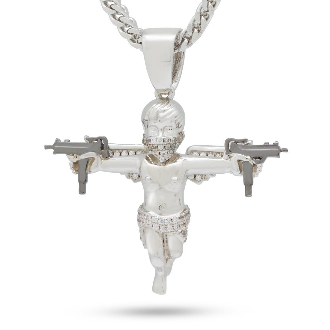 The Dual Uzi Angel ditches the standard bow and arrow for a more street and edgy look. Wielding dual uzies that are plated with black gold is definitely a new take to the term "Guardian Angel." Each vibrant piece is finished with ionic white gold plating. More than 100 high quality CZ stones line the angels' wings and bandanna for an icy finish. Each pendant is paired with a 2.5mm, 20" Stainless Steel Franco chain.