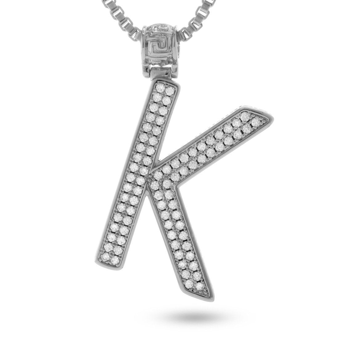 Lined with handset CZ stones, each "K" initial pendant provides a signature streetwear look, complete with white gold plating and a 2mm box chain. Order yours today.